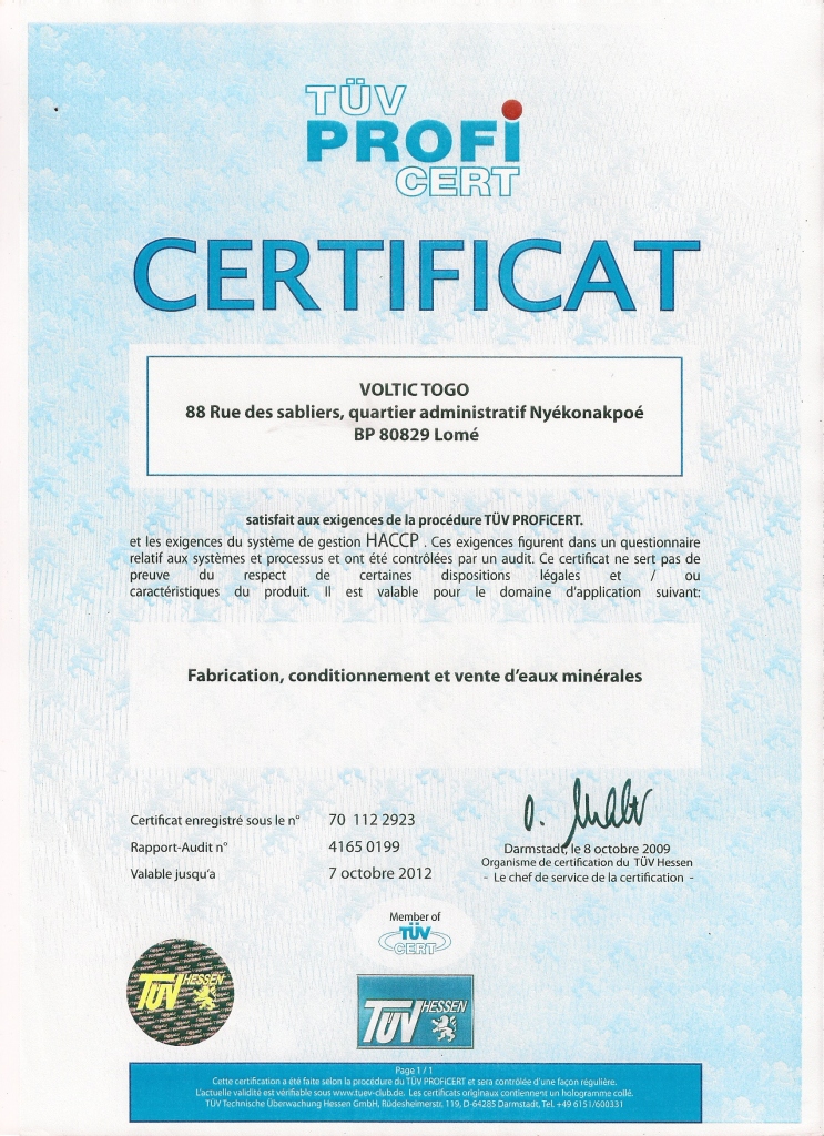 La société VOLTIC TOGO SARL depuis plusieurs années se fait accompagner de façon continue par des spécialistes de la qualité, ce qui lui a valu d’abord depuis 2009 d’être certifiée HACCP.
