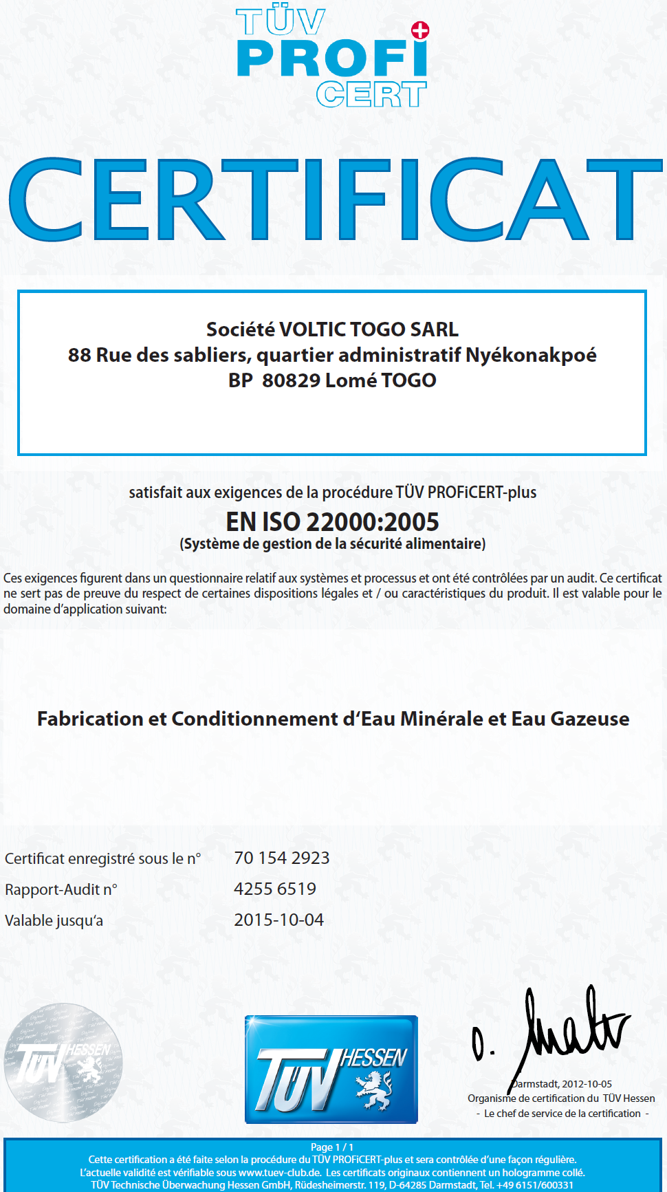 La norme ISO 22000 spécifie des exigences pour un système de management de la sécurité des produits alimentaires. Les compétences de voltic en la matière ne sont plus à démontrer. Elle a prouvé ses aptitudes et capacités à maîtriser les dangers liés à la sécurité de ses produits. Ces derniers constituent des produits sûrs qui satisfont aux exigences internationales. Bureau Veritas Certification est le leader mondial de la certification. Leur filiale Bureau Veritas à la suite d’un audit et avis favorable de leur comité, a délivré à Voltic un certificat, selon la norme ISO 22000 en novembre 2015.